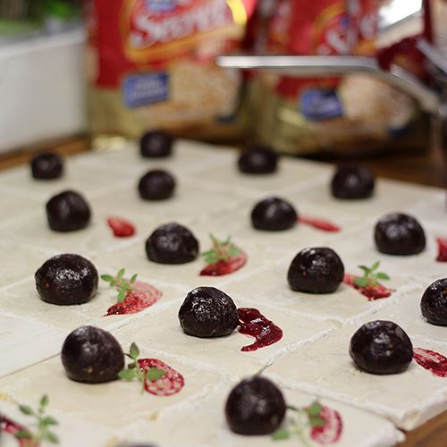 Trufle podajemy z odrobiną musu malinowego i bazylią.