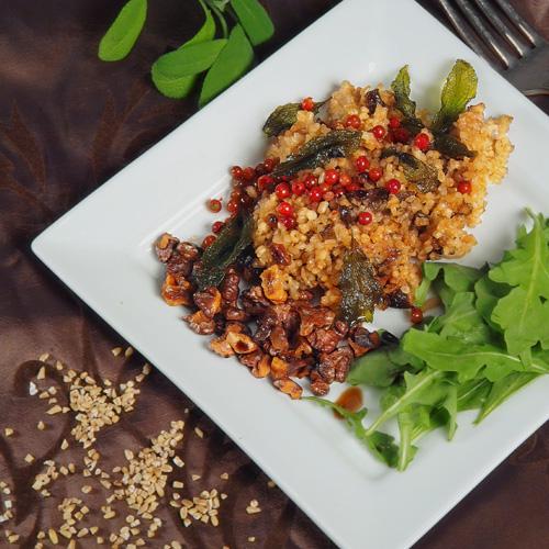 Na patelni rozgrzewam liście świeżej szałwii, dodaję masło klarowane, podsmażam na wyższym ogniu aż liście staną się chrupiące, na koniec wrzucam na patelnię orzechy i po chwili zdejmuję z ognia. Kaszę mieszam z pieprzem. Na głęboki talerz wykładam garść osuszonych liści rukoli, łyżkę kaszy, podsmażone orzechy a całość polewam masłem szałwiowym z chrupiącymi listkami i skrapiam sosem sojowym z miodem.