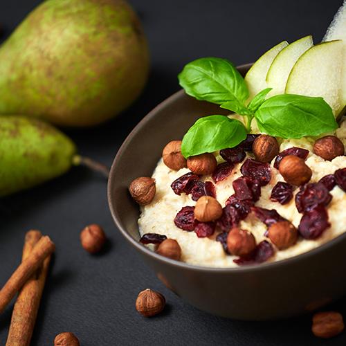 6. Nałóż owsiankę do miseczek, dodaj orzechy, żurawinę oraz wcześniej przygotowane gruszki.