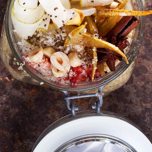 1. Płatki owsiane zalewamy świeżym sokiem z odrobiną wody i korzennymi przyprawami.