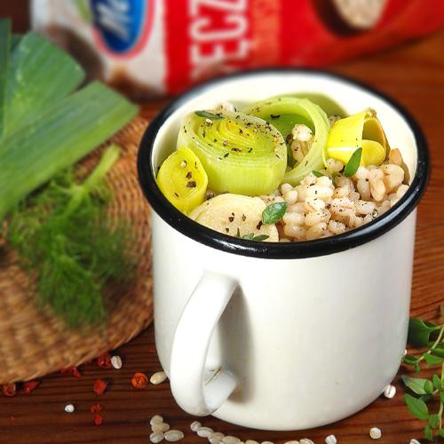 Pęczak przepłukuję na sicie, podprażam na łyżeczce masła klarowanego, zalewam szklanką wody i gotuję aż wchłonie wodę.