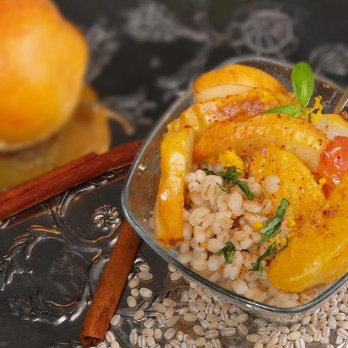 Nastawiam piekarnik na 180 stopni. Gruszki i kawałki pomarańczy zalewam sokiem z pomarańczy, posypuję cukrem, cynamonem, kardamonem, szczyptą utartej skórki i wstawiam na około 15-20 minut. Gotowe mieszam z pęczakiem i serwuję z listkami świeżej bazylii lub mięty.