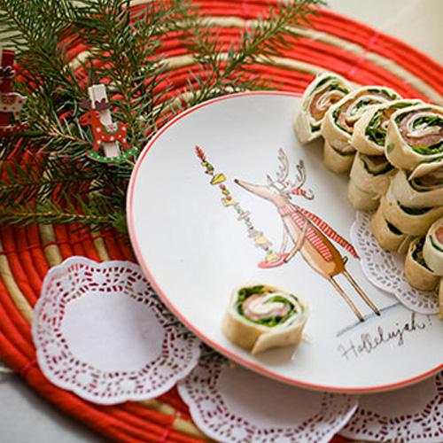 Tortillę posmaruj serkiem, dodaj ruccolę, a na wierzchu rozłóż kawałki łososia. Zroluj ścisło i pokrój na małe porcje.