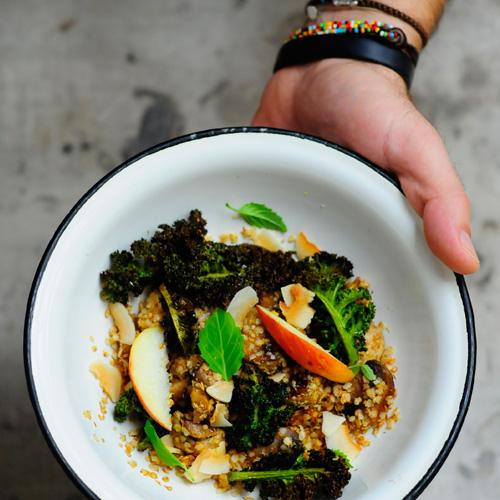 Sałatka z pieczonego jarmużu, quinoa z pieczarkami i jabłkiem