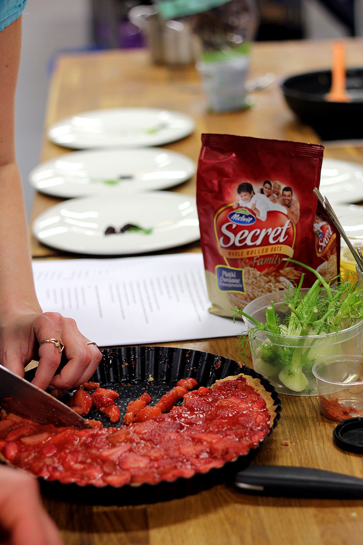 Dużym zainteresowaniem cieszyły się tarty owsiane z porem i fenkułem oraz rabarbarem i truskawkami. Grzegorz zaskoczył nas połączeniem kaszy owsianej z kiszoną cytryną w pysznym tabbouleh podanym z pstrągiem i szparagami, a na deser uczestnicy przygotowali owsiane trufle z chili i różaną granolę. Wszystko wyglądało pięknie i równie dobrze smakowało, a co najważniejsze było zdrowe i naturalnne.
