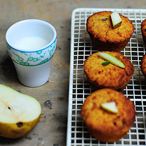 Babeczki bezglutenowe z gruszką, suszonymi wiśniami, tymiankiem i migdałami