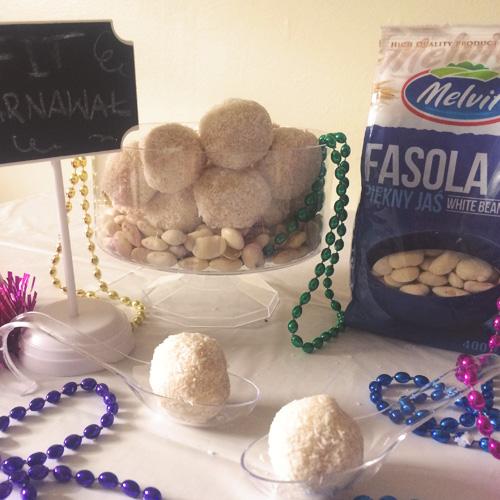Fasolę ugotuj według przepisu na opakowaniu (namocz wcześniej na noc). Migdały namocz we wrzątku i zdejmij skórkę (można kupić już obrane) Fasolę zmiksuj na gładką masę. Dodaj wiórki i miksuj, dodając kolejne składniki. Mleka nie wlewaj od razu, ale partiami do uzyskania odpowiedniej konsystencji. Uformuj kulkę, wypełnij migdałem i obtocz w wiórkach kokosowych.