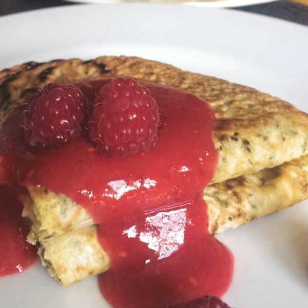 Wymieszaj oba rodzaje mąki z nasionami chia. Dodaj 1 jajko, roztopiony olej kokosowy odrobine mleka oraz taka ilość wody, aby uzyskać typowo naleśnikowe ciasto. Dzięki wodzie gazowanej naleśniki będą puszyste. Następnie usmaż na suchej patelni cienkie naleśniki. Powinny być blade, dosmażysz i zarumienisz je po dodaniu sera.