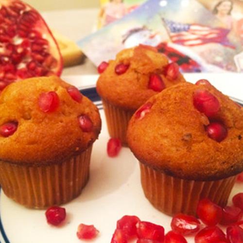 Nagrzej piekarnik do temperatury 180 stopni i wysmaruj malutkie foremki do muffinek (ja użyłam spray'u kuchennego). W misce rozgnieć banana następnie dodaj jajka, sok z granat, ekstrakt z wanilii I mleko migdałowe. Wymieszaj dokładnie do uzyskania jednolitej masy. Dodaj resztę składników i wymieszaj. Przełóż masę do foremek do ½ wysokości. Ziarna granatu połoz na wierzchu każdej muffinki I piecz ok 20-25 min. Po wystygnięciu udekoruj masłem migdałowym.