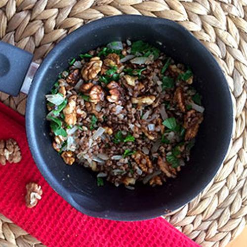 Kaszę zatrzyj* z lekko ubitym jajkiem. Wsyp do rozgrzanego rondla i chwilkę upraż. Po ok. 2 minutach wlej 2 szklanki wrzątku , dopraw solą i świeżo mielonym pieprzem według uznania. Przykryj i ugotuj na małym ogniu, aż kasza zmięknie i wchłonie prawie całą wodę. Zdejmij garnek z ognia, zawiń w koc i odstaw na 10-20 minut. W tym czasie podsmaż orzechy na połowie masła ciągle mieszając. W rondlu rozgrzej pozostałą część masła z oliwą i na małym ogniu zeszklij posiekaną cebulę wymieszaną z tymiankiem. Dodaj kaszę, orzechy włoskie i natkę, dopraw do smaku solą i pieprzem.