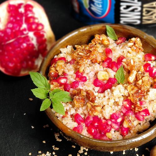 Kremowa kasza owsiana z granatem, słonymi orzechami laskowymi i listkiem mięty