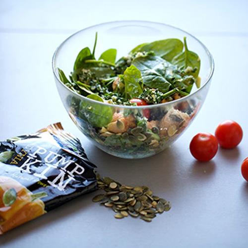 Ugotuj kaszę pęczak wg przepisu na opakowaniu, odstaw do wystygnięcia. Przygotuj sos. Pietruszkę, czosnek i płatki migdałowe posiekaj, wymieszaj z oliwą z oliwek i sokiem z limonki, odstaw na chwilę. Pestki dyni upraż na patelni. Pierś z kurczaka umyj, oczyść, pokrój w kostkę i usmaż na niewielkiej ilości tłuszczu. Przekrój pomidorki na pół, ogórka słupki, avocado w kostkę. Wymieszaj wszystkie składniki. Przed podaniem polej przygotowanym wcześniej sosem. Możesz doprawić ulubionymi przyprawami.