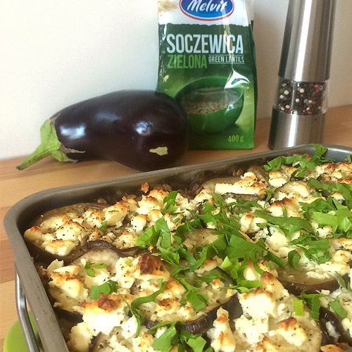 W naczyniu żaroodpornym układaj warstwami na przemian bakłażany i masę soczewicową (zaczynając i kończąc na bakłażanach). Całość posyp pokruszonym serem feta i zapiekaj w piekarniku nagrzanym do 180 stopni ok 30min. Przed podaniem posyp obficie pietruszką.