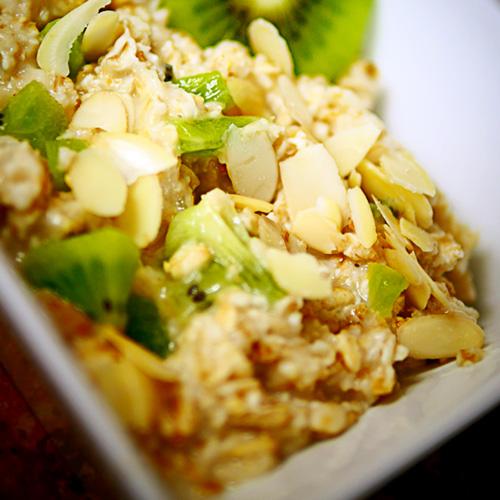 3. Kiwi i banana obierz i pokrój w kostkę. Dodaj owoce i migdały do owsianki i wymieszaj.